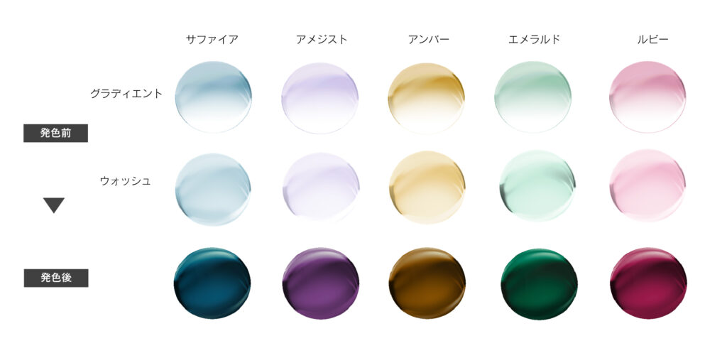 「サファイア」「アメジスト」「アンバー」「エメラルド」「ルビー」の5色。